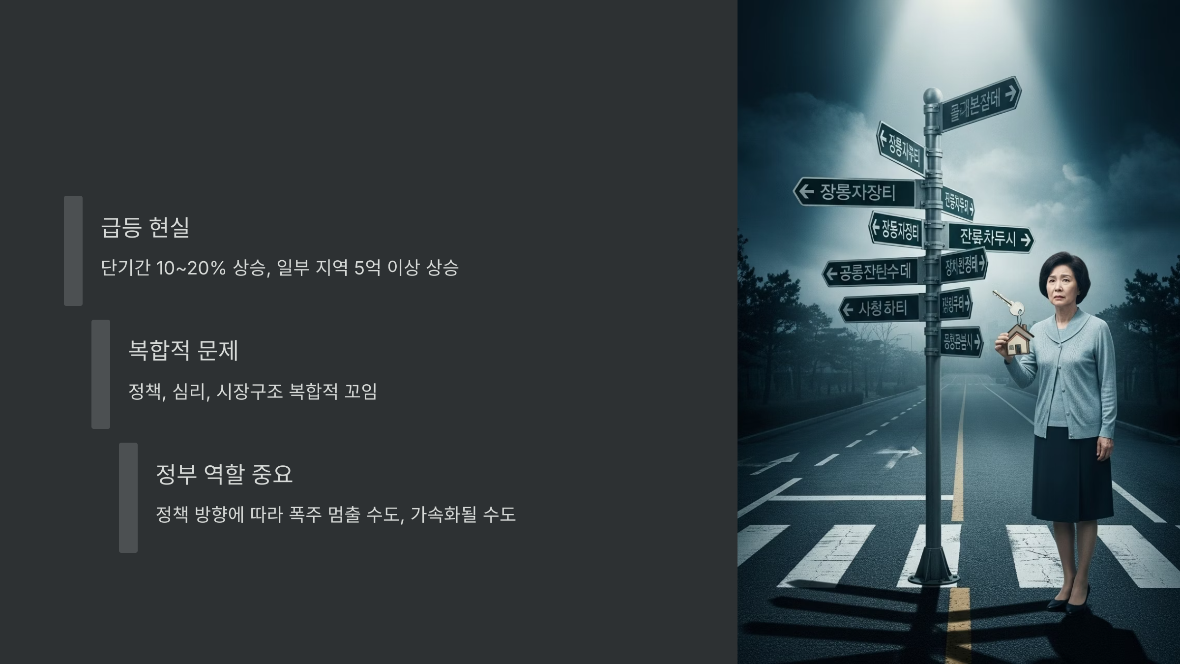 정책, 심리, 시장 구조가 복합적으로 꼬여 있는 상황.