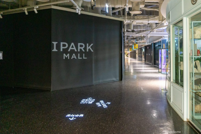 한 층 더 올라가야 함 (표지판 확인 필수) - 몰 내부 바닥에 조명형 안내가 비춰져 있어