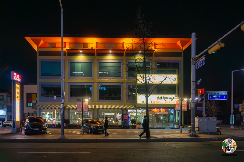 명가원 설농탕의 큰 입간판. 24시간 운영을 강조하는 붉은색 조명과 '출구' 안내 표시가 있다.